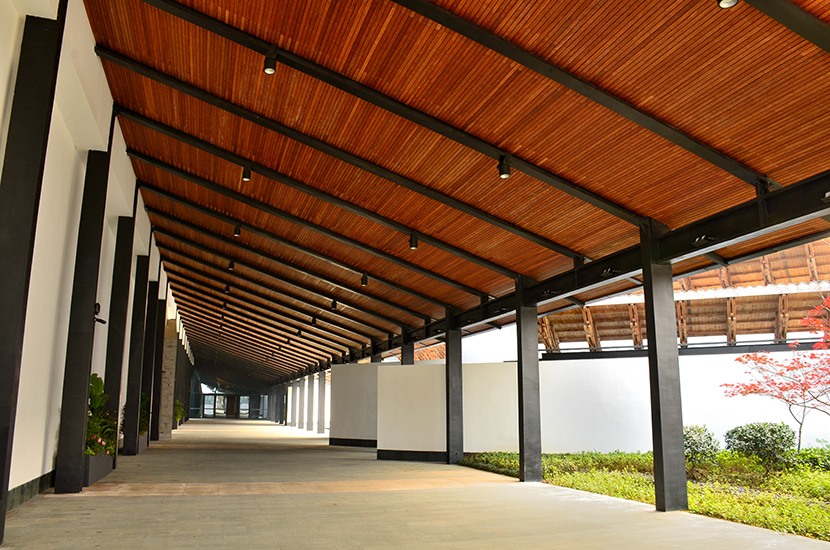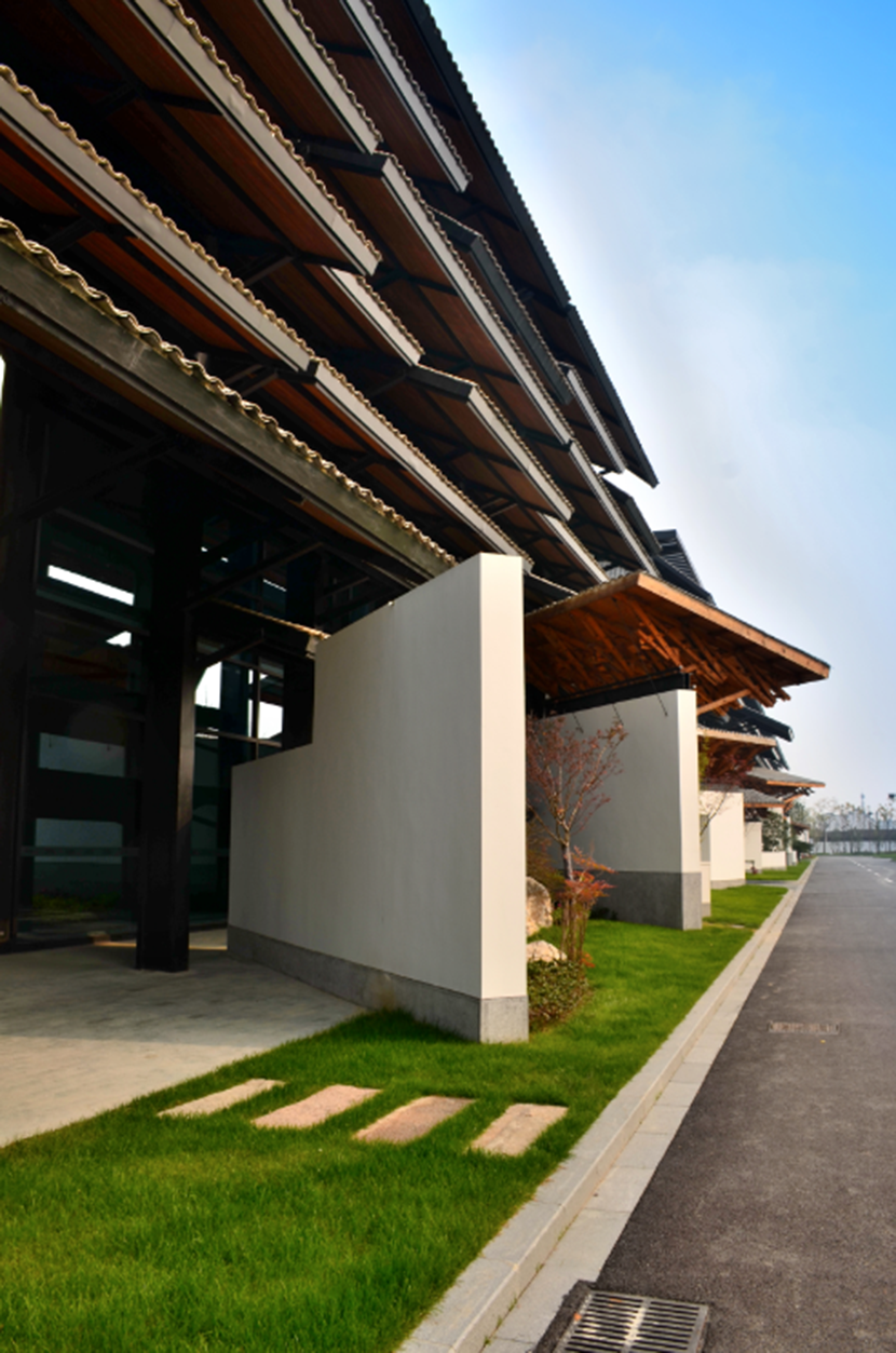 該會展是世界互聯網大會的主場館,也是今后烏鎮景區承接會議、會展的主要場所。 整個會址以水為媒,三座主要建筑沿南、東、北三個方向圍繞中心水池而建,池邊柱廊林立,廊內漫步通行。整體建筑融入大量白墻黛瓦、臨水連廊等經典江南水鄉特色元素,凸顯傳統文化與現代文明的融合共生。