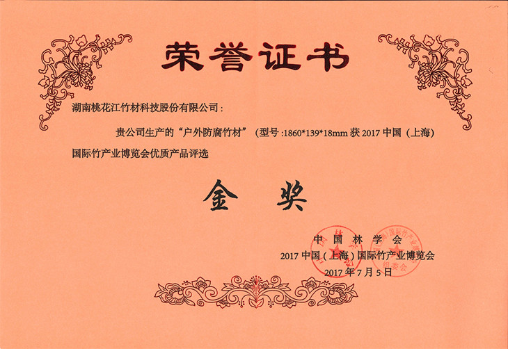 湖南桃花江竹材科技股份有限公司生產的戶外防腐竹地板在2017年7月中國(上海)國際竹產業博覽會中榮獲金獎,該獎項由中國林學會、中國(上海)國際竹產業博覽會頒發。湖南桃花江竹材科技作為中國竹材領域高炭防腐技術的發明者,在中國竹材領域有著舉足輕重的地位。湖南桃花江竹材科技一直專注與于竹材的戶外運用研發與創新,為全球客戶提供優質竹材。